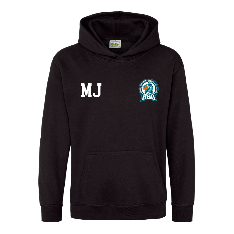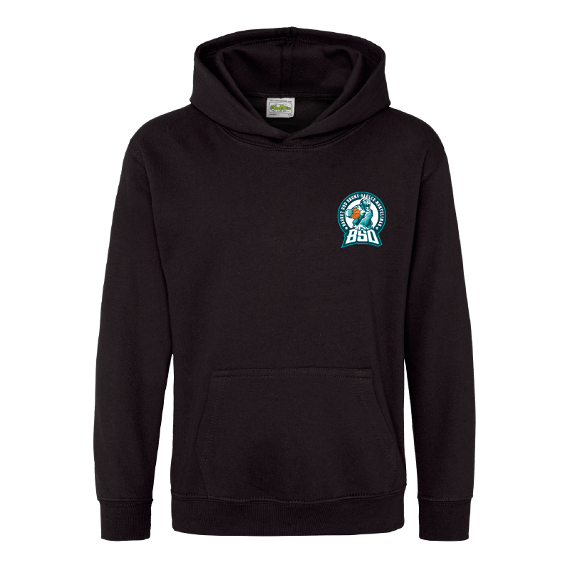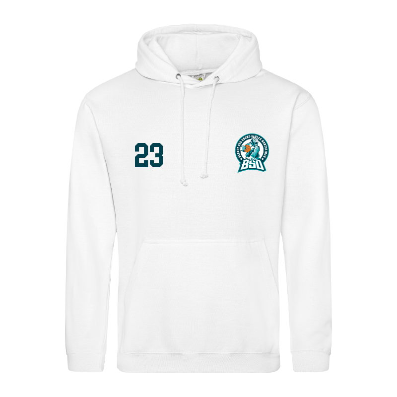 Sweat à capuche BSD noir, blanc ou gris chiné. Logo quadri côté cœur.